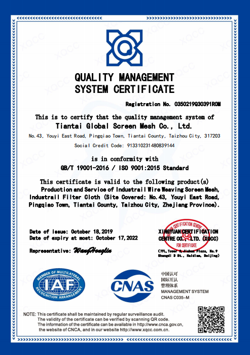 天臺環(huán)球篩網(wǎng)有限公司,成立于1995年,座落在東海之濱美麗的天臺山腳下,注冊資金500萬人民幣,公司已通過ISO9001:2015國際質(zhì)量體系認(rèn)證。經(jīng)過環(huán)球人的不斷努力,目前公司已擁有標(biāo)準(zhǔn)廠房10,000平方米,各種篩網(wǎng)設(shè)備近100臺,員工100余人,其中高中級科研及管理人員10人,公司產(chǎn)品主要有:不銹鋼網(wǎng),銅網(wǎng),電焊網(wǎng),電焊網(wǎng)片,軋花網(wǎng),不銹鋼延伸產(chǎn)品,單復(fù)絲濾布,濾布袋,壓濾機(jī)袋等。
